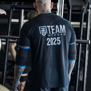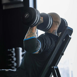 Erittäin vahva kompressio ja tuki: Triple Ply Elbow Sleeves, joissa on polyesteri-/kumisekoitus, estävät kyynärnivelen taipumista ja tarjoavat mekaanisen edun raskaissa punnerruksissa.